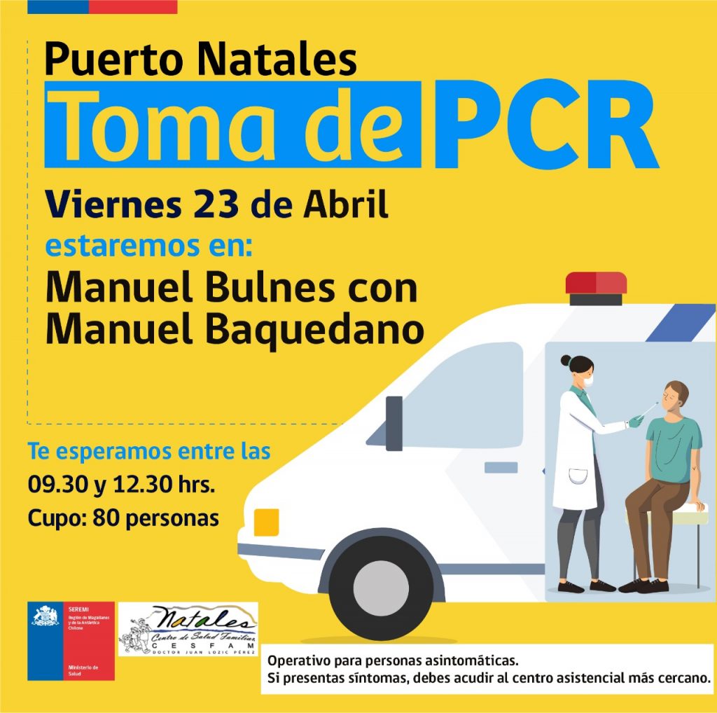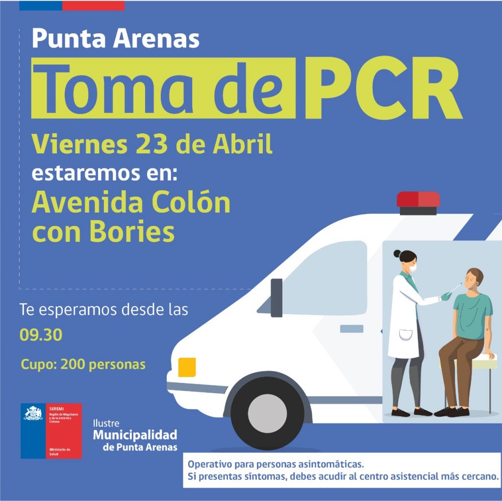 Conforme a lo planificado por el Servicio de Salud Magallanes la toma voluntaria de exámenes PCR se efectuará este viernes 23 de abril en Punta Arenas, Porvenir, Puerto Natales y Timaukel.