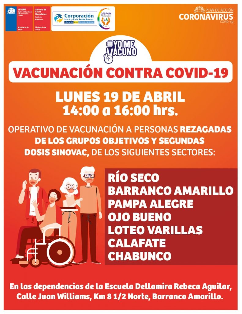 Un operativo de vacunación a personas rezagadas de los grupos objetivos y segundas dosis Sinovac se efectuará este lunes 19 de abril en distintos puntos rurales y periurbanos de la ciudad de Punta Arenas.