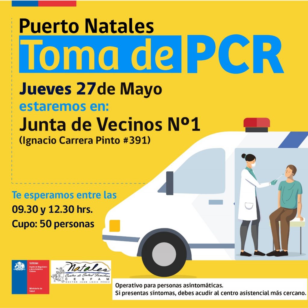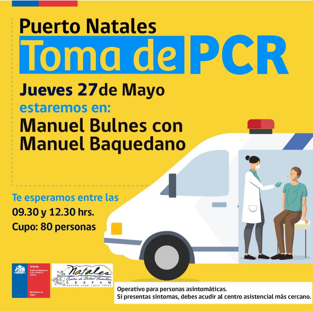 Siguiendo con los operativos organizados por el Servicio de Salud en la región de Magallanes la Toma de PCR se efectúa este jueves 27 de mayo en Puerto Natales, Punta Arenas y Porvenir.