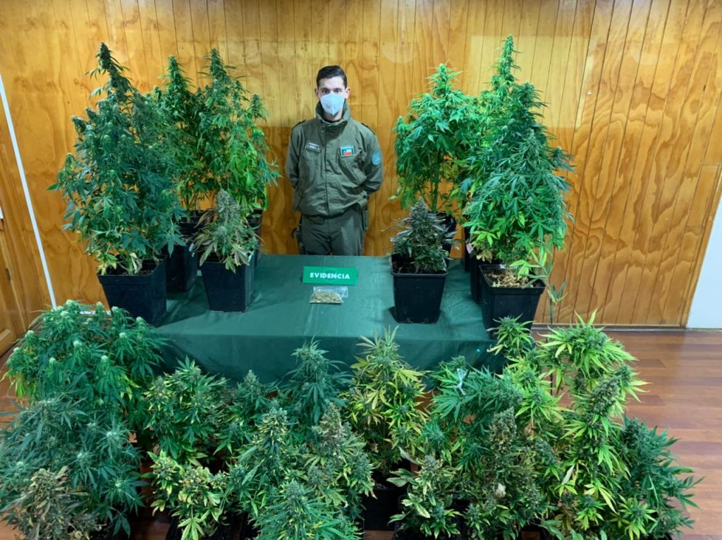 En el inmueble, Carabineros encontró 18 gramos 100 miligramos de marihuana y 28 plantas de Cannabis con una medida 34 cm a 95 cm.