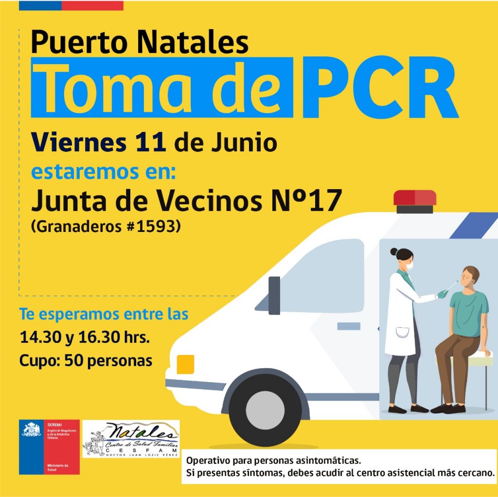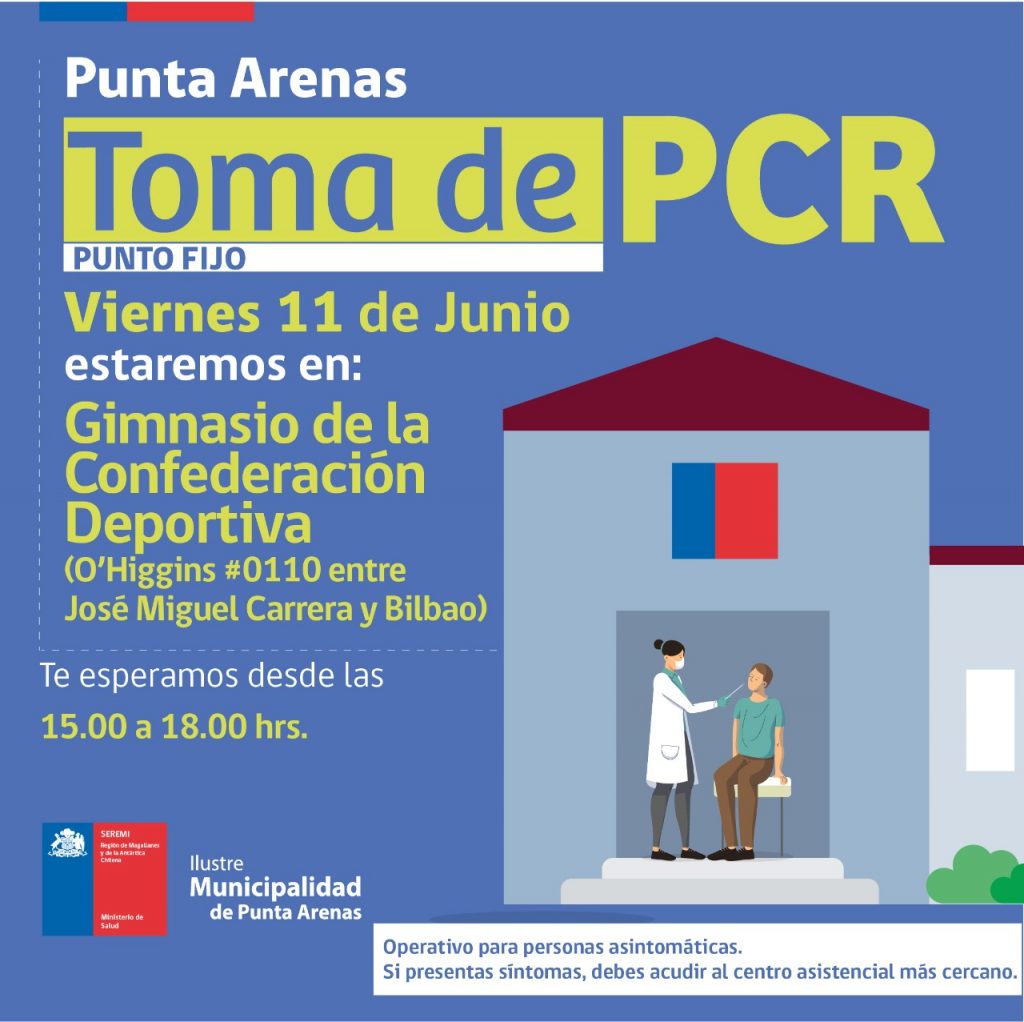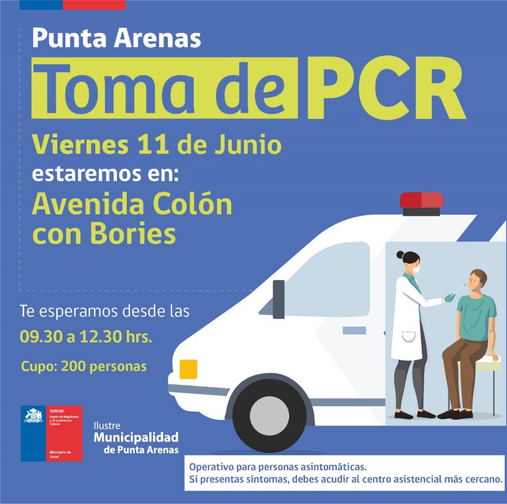 Operativos de toma de PCR se realizan hoy en Punta Arenas, Puerto Natales, Porvenir, Puerto Williams y en Tierra del Fuego Ovejero Noticias 11 de junio de 2021 NOTICIAS, SALUD PUBLICA, TITULARES CompartirTwittearCompartirPin0 Compartir