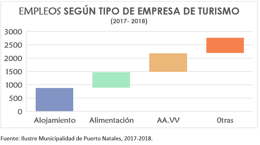 Sólo en la comuna de Puerto Natales 2.768 personas trabajaban en los diferentes rubros de la actividad turística. Las cifras formales respaldan que en la temporada 2017-2018 el 80% de las personas que trabajan en turismo son residentes locales y el 20% corresponde a personal que venía desde otras regiones del país en temporada alta.