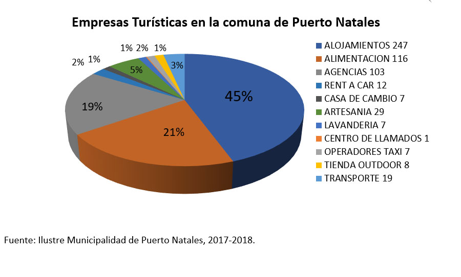 Según datos de la Ilustre Municipalidad de Puerto Natales, durante la temporada 2017-2018 el total de empresas de turismo catastradas fueron 556, y correspondían a empresas formales que cumplían con el marco de legalidad exigido. Durante el mismo periodo la mayor cantidad de empresas de turismo estaban concentradas en el rubro de alojamientos (247) y, en segundo lugar, estaban los establecimientos de alimentación (116) y le seguían las agencias de viajes locales.