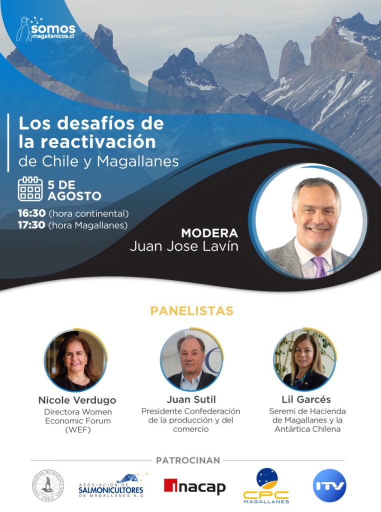 El encuentro, titulado “Los desafíos de la reactivación de Chile y Magallanes”, contará con la presencia de Juan Sutil, presidente de la Confederación de Producción y Comercio (CPC); Nicole Verdugo, directora del Women Economic Forum; y Lil Garcés, Seremi de Hacienda de Magallanes. El conversatorio se realizará el próximo jueves 5 de agosto a las 16:30 horas Santiago y 17:30 horas Magallanes, instancia que será moderada por el periodista Juan José Lavín.