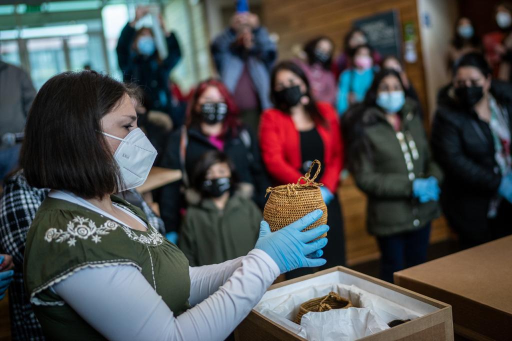 En una simbólica ceremonia, efectuada en el Centro Cultural de Punta Arenas, a un costado del Estrecho de Magallanes, representantes de las comunidades “Indígena Yagán Lom Sapakuta», de la capital regional y “Bahía Mejillones”, de Puerto Williams, recibieron los objetos elaborados por sus ancestros.