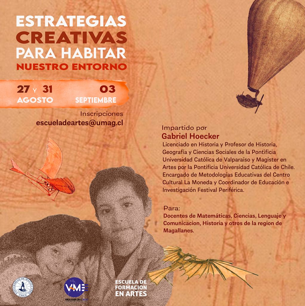 Este curso está dirigido a docentes de Ciencias, Matemáticas, Lenguaje y Comunicación, Historia y otros. Plantea la comprensión de la creatividad como una capacidad humana y desde esta premisa se presentarán herramientas didácticas flexibles que facilitarán a los y las participantes articular actividades que constituyan puentes para el acceso a los lenguajes y saberes de diferentes disciplinas, explorando los vínculos artísticos y patrimoniales con la contemporaneidad. Su objetivo es ofrecer estrategias didácticas que fortalezcan los contenidos desarrollados por docentes de diversas disciplinas, entendiendo la creatividad como una herramienta pedagógica capaz de estimular la reflexión crítica desde la participación, la colaboración y la empatía. Este taller se impartirá los días 27 y 31 de agosto y 03 septiembre. Para inscribirse en este taller gratuito (de cupos limitados) hay que escribir al correo escueladeartes@umag.cl.