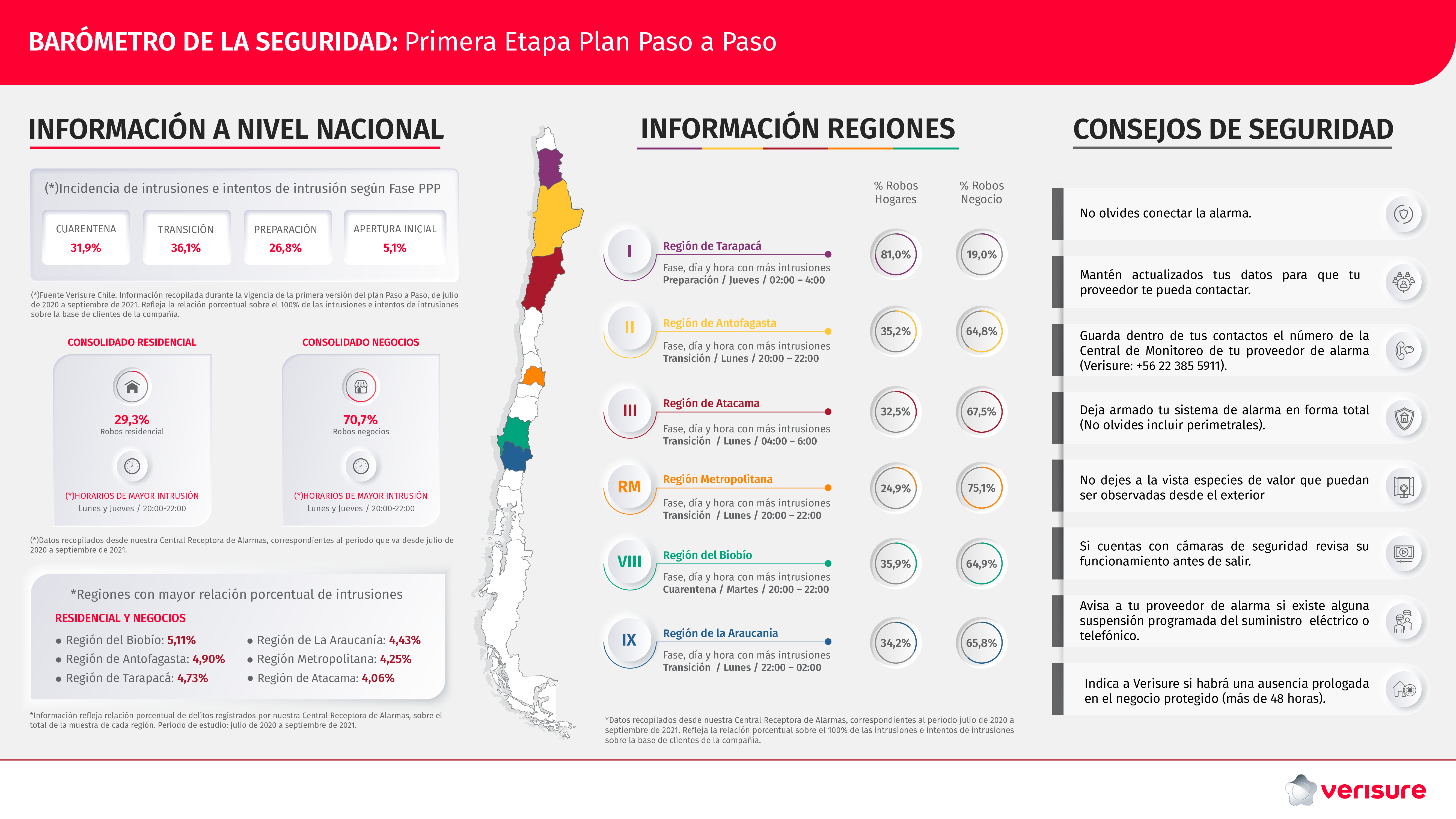 El 6 de enero se registró un alza significativa en los casos diarios de Covid-19, con un reporte total de tres mil 134 contagios, el número más alto de los últimos seis meses. Lo que esto conlleva ha generado mucha incertidumbre sobre cómo estas variaciones en los contagios, sumadas las nuevas variantes podrían afectar en términos de seguridad y movilidad. Conscientes de esta preocupación, Verisure elaboró el estudio “Barómetro Plan Paso a Paso 2021”, el que analizó datos propios recopilados durante la versión más restrictiva de la estrategia sanitaria, determinando que la fase de “Transición” fue aquella con mayor incidencia delictual, concentrando un 36,1% del total de intrusiones e intentos de intrusión durante dicho periodo.