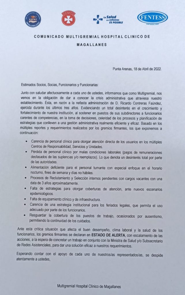 Autoridades nacionales del Ministerio de Salud fueron informadas por los gremios en conflicto en el Hospital Clínico Magallanes