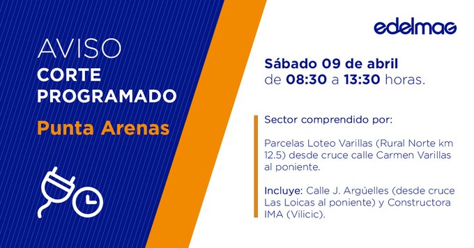 La empresa EDELMAG informa que este sábado, 09 de abril, se realizará una interrupción del suministro eléctrico de #PuntaArenas, debido a trabajos de mantenimiento en las redes de distribución, en los horarios y sectores que se indican: