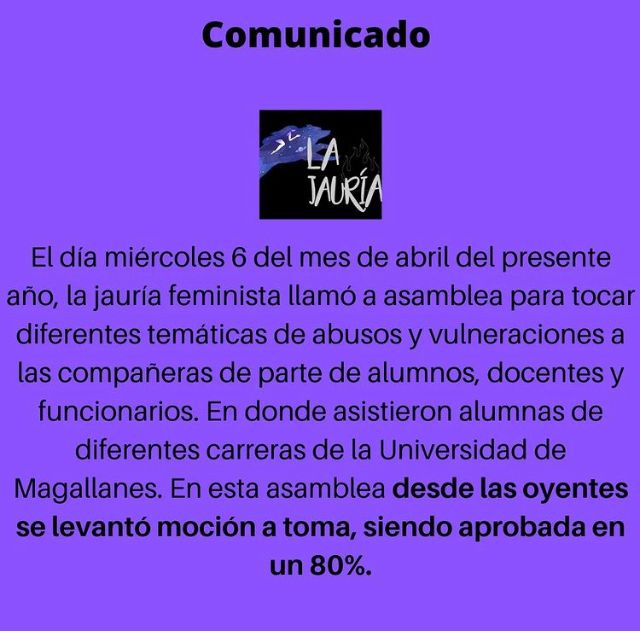 El colectivo Jauría Feminista de estudiantes de la Universidad de Magallanes procedió a la toma de las instalaciones de la Universidad de Magallanes, campus de Avenida Bulnes, a las 03.00 hs. de esta madrugada de jueves 7 de abril.