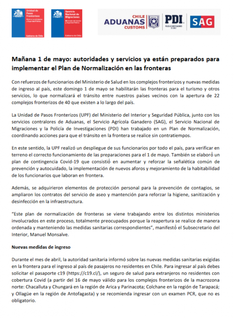 El siguiente es el COMUNICADO sobre el Plan de Normalización de Fronteras de la Unidad de Pasos Fronterizos @min_interior, emanado del Servicio Nacional de Migraciones.