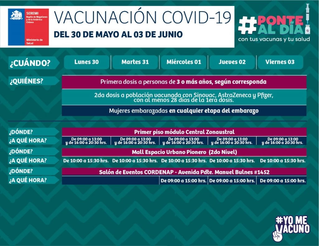 Calendarios de vacunación en Magallanes | Contra covid19 e influenza Ovejero Noticias 29 de mayo de 2022 NOTICIAS, SALUD PUBLICA, TITULARES Los siguientes son los calendarios de vacunación para la semana del 30 de mayo al 4 de junio. CompartirTwittearCompartirPin0 Compartir