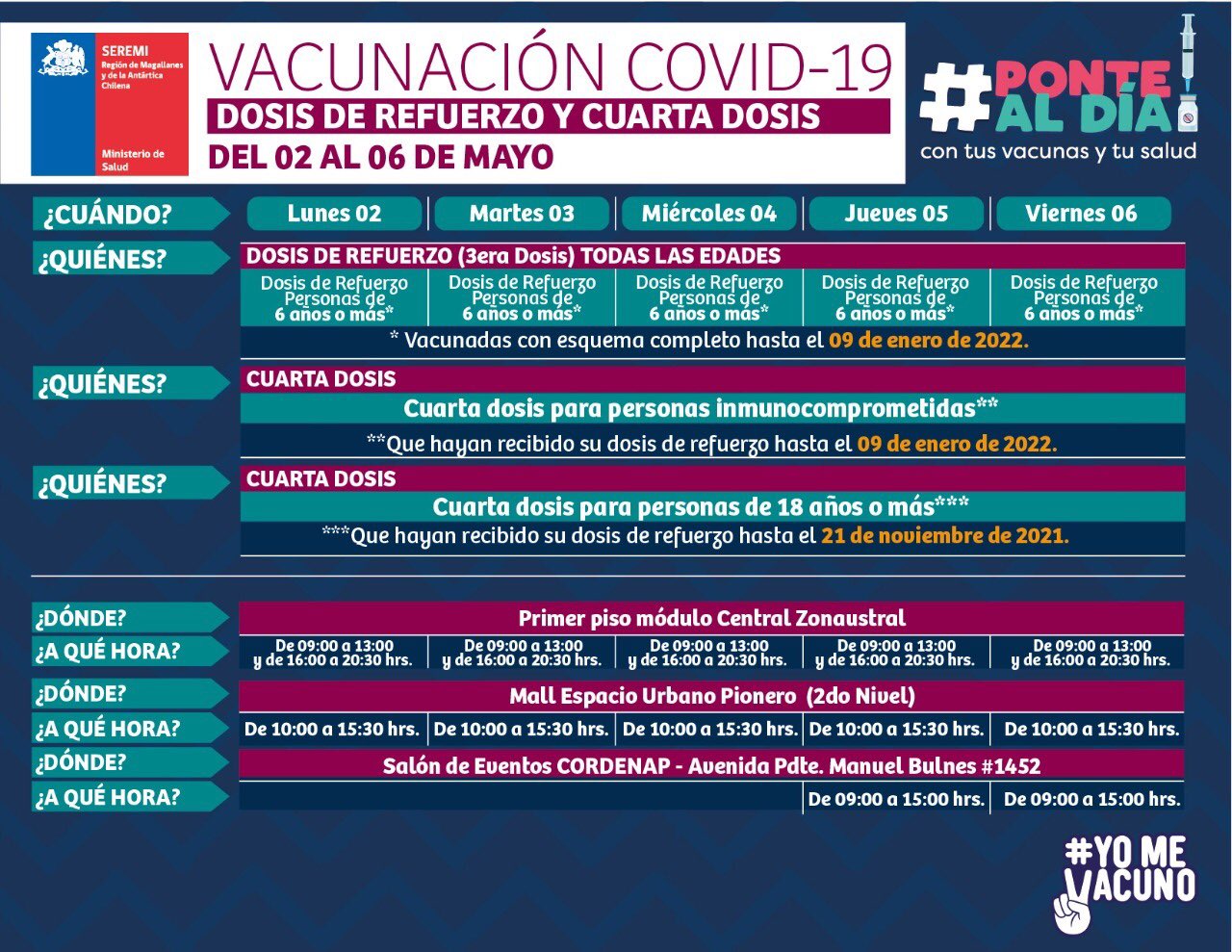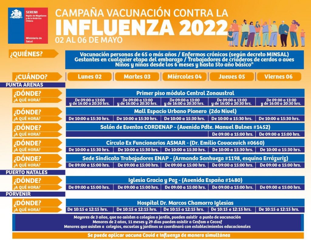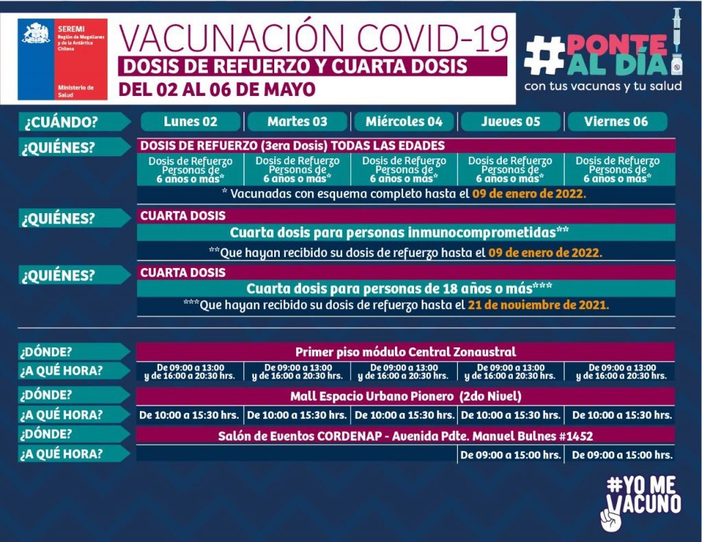 Calendarios de vacunación en Magallanes esta semana del 2 al 7 de mayo Ovejero Noticias 2 de mayo de 2022 NOTICIAS, SALUD PUBLICA, SEREMI DE SALUD MAGALLANES, TITULARES Los siguientes son los Calendarios de vacunación en Magallanes esta semana del 2 al 7 de mayo, difundidos por la autoridad sanitaria en nuestra región. CompartirTwittearCompartirPin0 Compartir