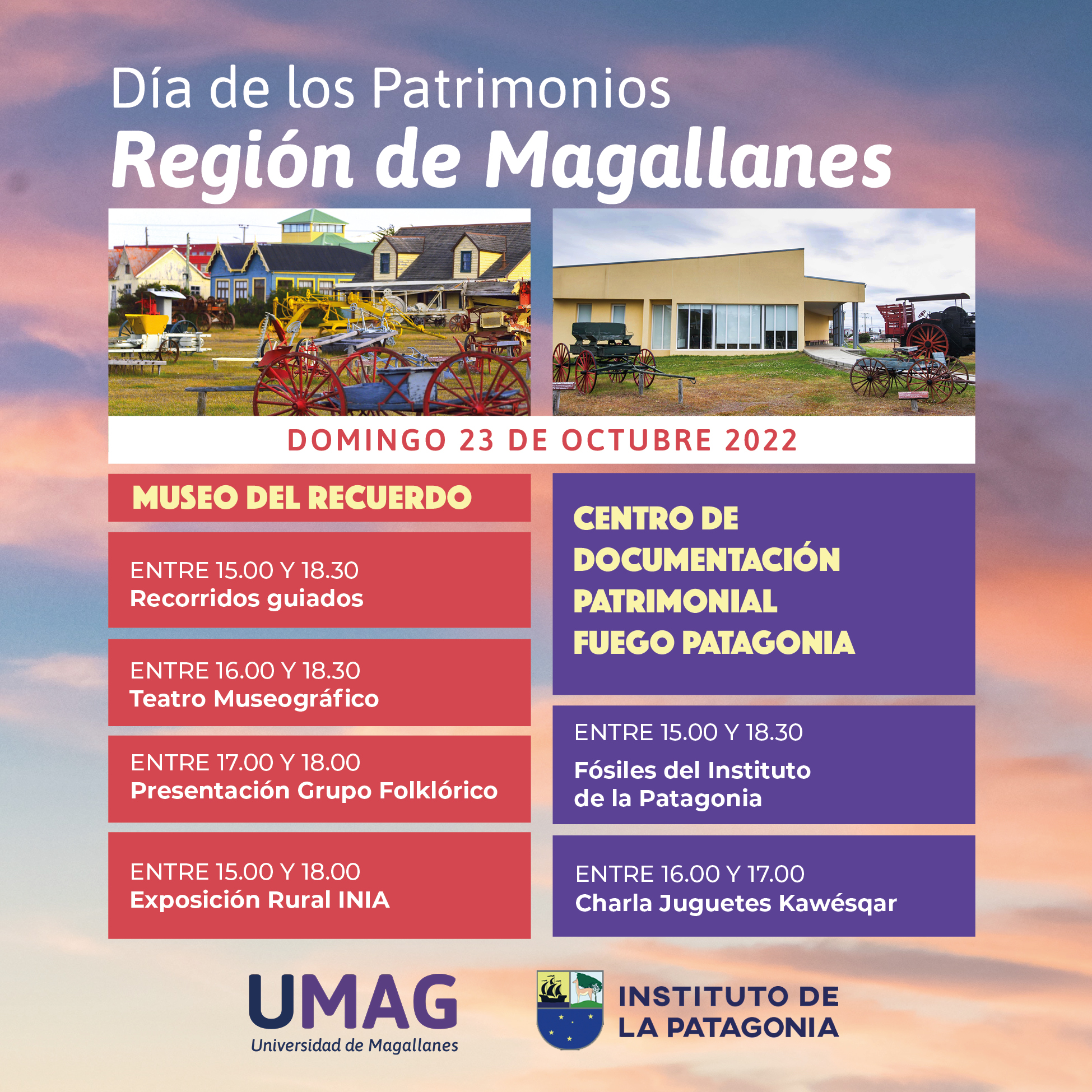 La Universidad de Magallanes se hará presente en el próximo DÍA DE LOS PATRIMONIOS EN LA REGIÓN DE MAGALLANES, que se celebrará a lo largo del país el domingo 23 de Octubre. Las actividades se realizarán en el Museo del Recuerdo y en el Centro de Documentación Patrimonial Fuego Patagonia, entre las 15:00 y 18:30 hrs. El listado de las actividades es el siguiente: