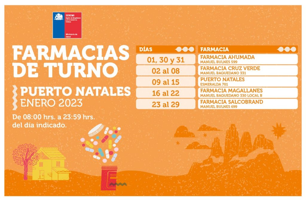 Farmacias de turno mes de enero de 2023 en Punta Arenas y Puerto Natales Ovejero Noticias 30 de diciembre de 2022 NOTICIAS, PUERTO NATALES, PUNTA ARENAS, SALUD PUBLICA Las siguientes son las Farmacias de turno durante el próximo mes de enero de 2023 en Punta Arenas y Puerto Natales. CompartirTwittearCompartirPin0 Compartir