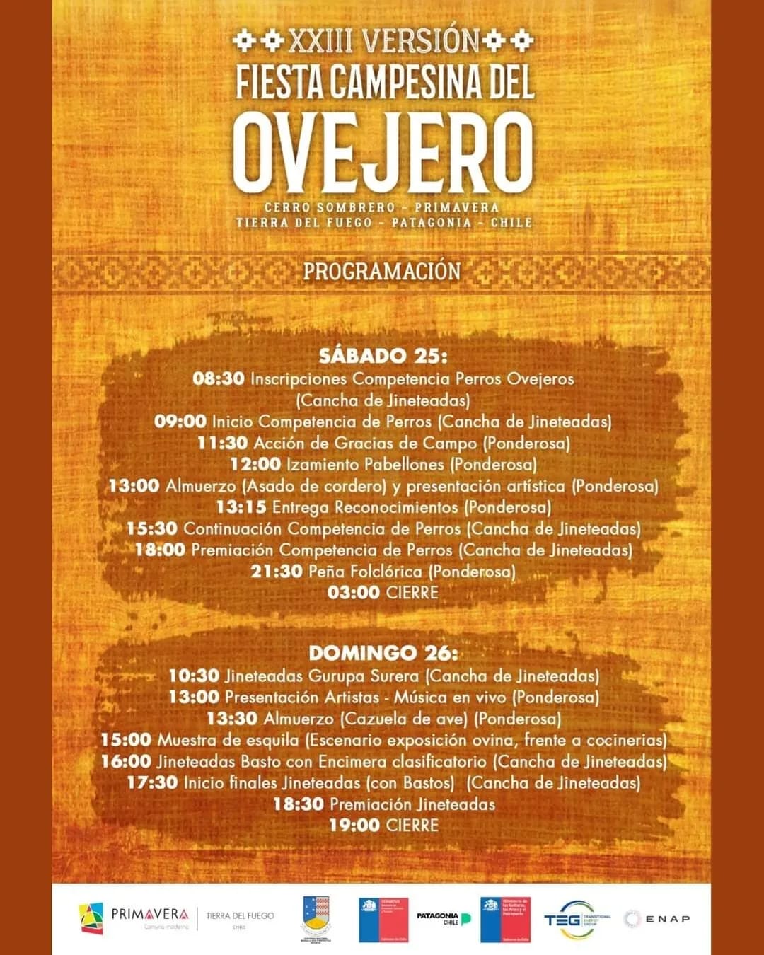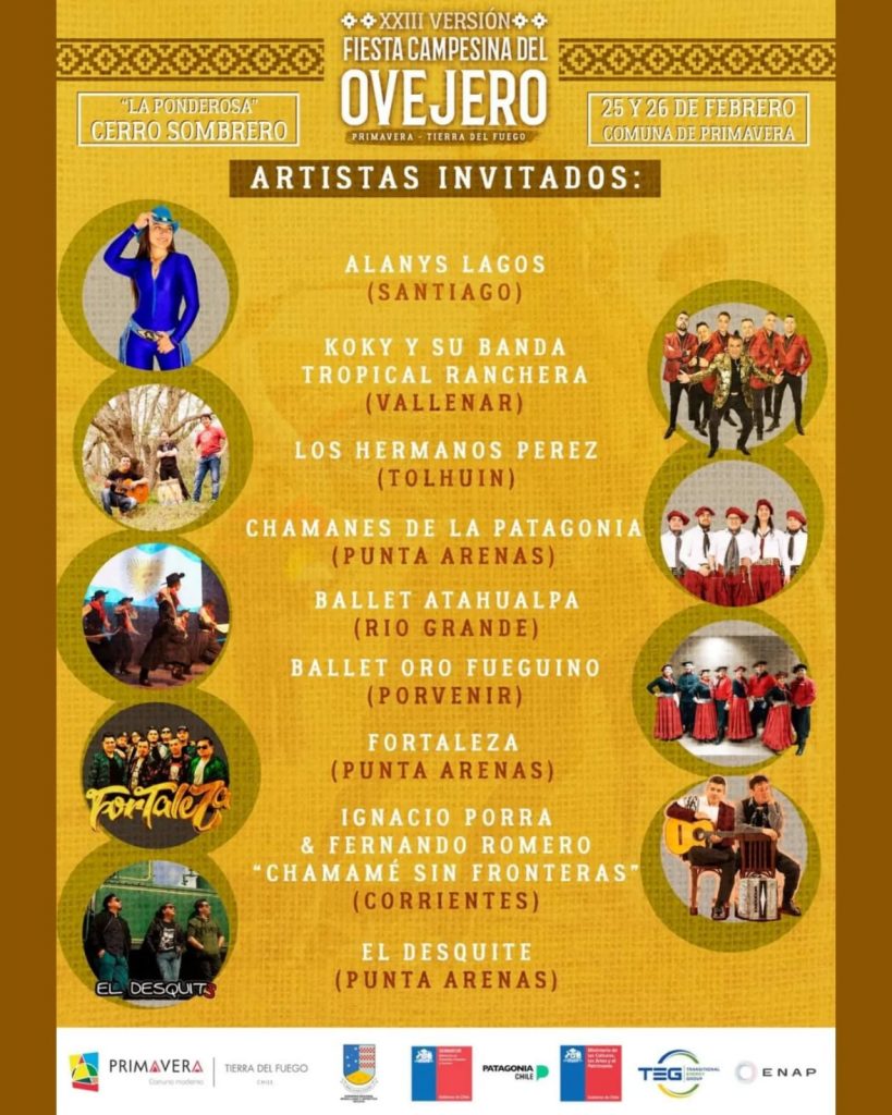 Hoy se inicia la 23a Fiesta Campesina del Ovejero en Cerro Sombrero, Tierra del Fuego Ovejero Noticias 25 de febrero de 2023 ARTES, CULTURA Y PATRIMONIO, MUNICIPALIDAD DE PRIMAVERA, TURISMO Programación del día sábado 25 y domingo 26 de febrero de la Fiesta Campesina del Ovejero en Cerro Sombrero, provincia de Tierra del Fuego. Parrilla de artistas invitados: CompartirTwittearCompartirPin0 Compartir