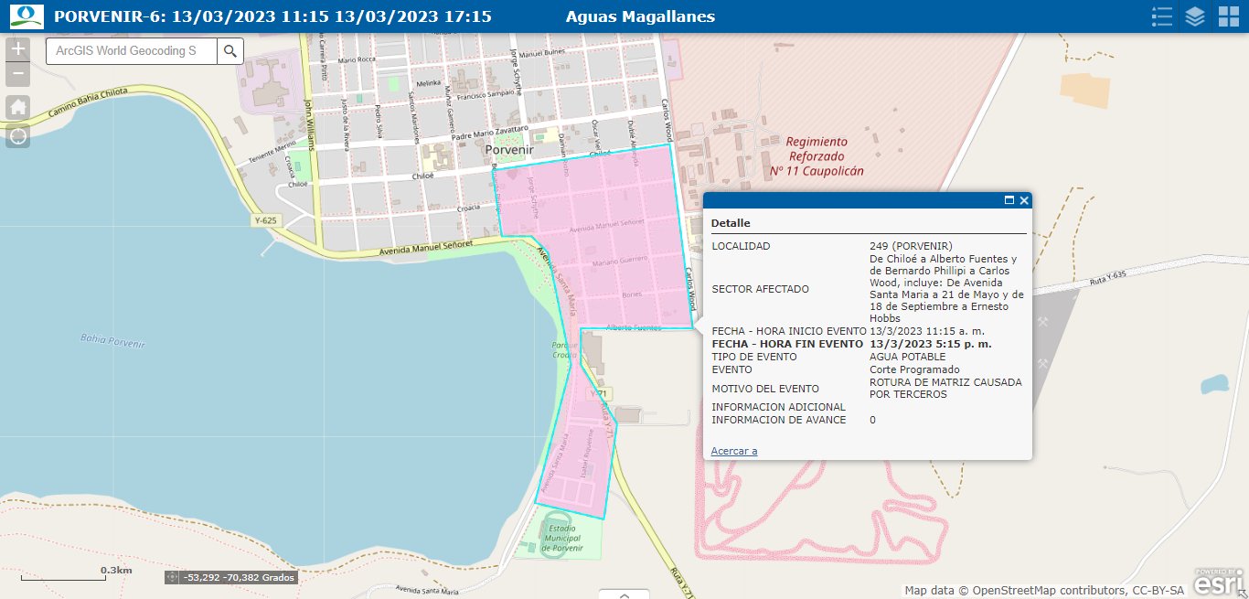 AGUAS MAGALLANES ha informado este lunes 13 de marzo del corte no programado desde las 11:15 hasta las 17:15 horas en la ciudad de Porvenir. Sector comprendido: de Chiloé a Mariano Guerrero y de Bernardo Phillipi a Damián Riobo. El corte se debe a rotura de matriz causada por terceros.
