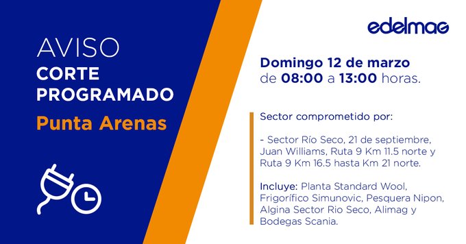EDELMAG informa que este domingo, 12 de marzo, se realizará una interrupción del suministro eléctrico de #PuntaArenas, debido a trabajos de mantenimiento en las redes de distribución, en los horarios y sectores que se indican.