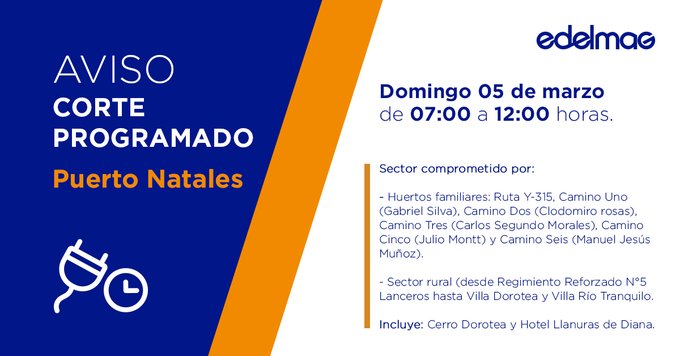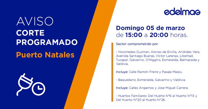 EDELMAG informa que este domingo, 05 de marzo, se realizará una interrupción del suministro eléctrico de #PuertoNatales, debido a trabajos de mantenimiento en las redes de distribución, en los horarios y sectores que se indican.