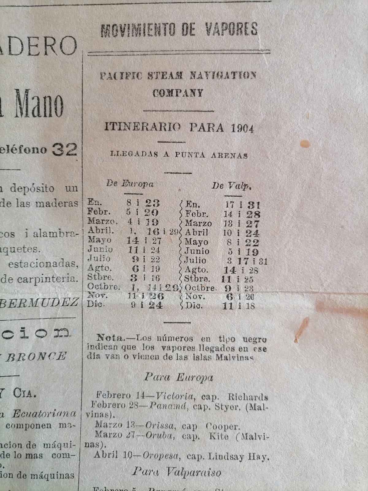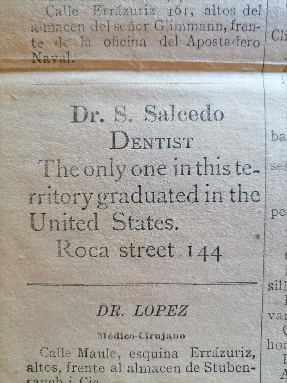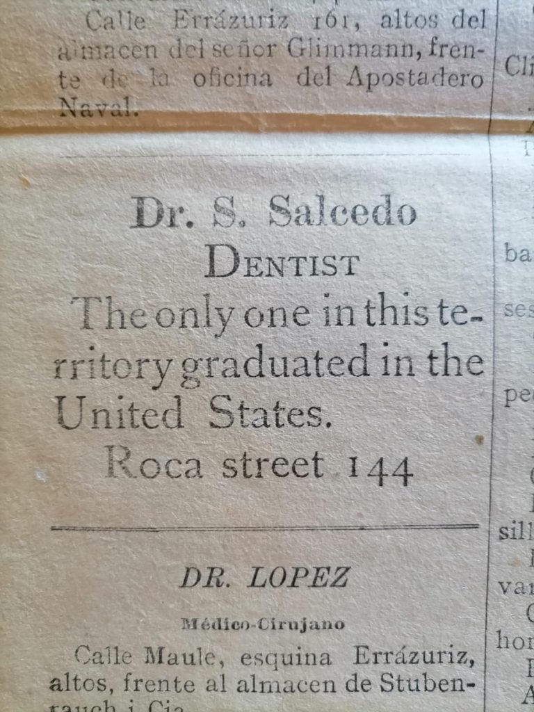 Entonces llegaban directamente desde Europa productos ingleses, alemanes, franceses, italianos, como prendas de ropa para hombres, mujeres y niños y telas diversas. El dentista S. Salcedo, instalado en Punta Arenas en 1903, único especialista titulado en Estados Unidos, publicaba en El Magallanes este curioso aviso en inglés: