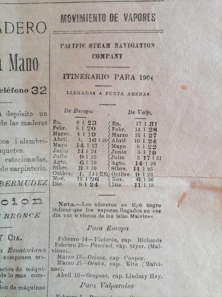 En el diario El Magallanes de 1898, por ejemplo, se anunciaba en su columna «Movimiento de Vapores» buques que recalaban en Punta Arenas y conectaban con los puertos de Valparaíso, Hamburgo, Liverpool y Le Havre en Francia. Pero, además, había un correo marítimo de la firma Braun y Blanchard que conectaba a Punta Arenas con Porvenir y con los «puertos del estrecho de Magallanes Cabo Negro, Isla Isabel, Pecket Harbour, Fenton Station, Oazy Harbour, Usefull Hill Station, Punta Espora (Tierra del Fuego) i Punta Delgada.»