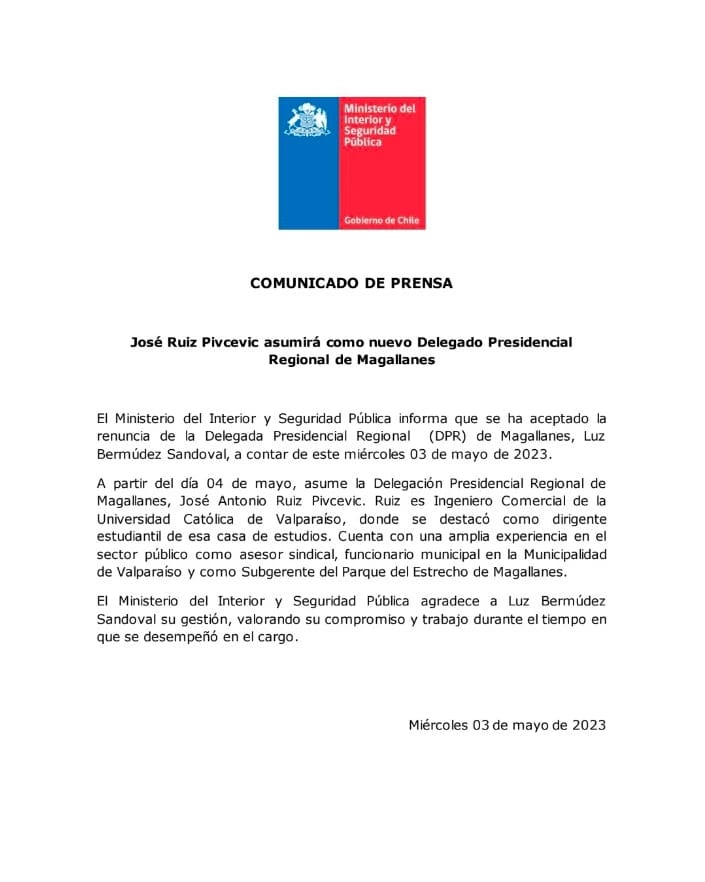 El Ministerio del Interior y de Seguridad Pública informó este miércoles 3 de mayo de la renuncia presentada a su cargo por Luz Bermúdez Sandoval, la que fue aceptada por el Presidente Gabriel Boric y designándose en el cargo a Jose Ruiz Pivcevic, profesional ingeniero comercial con experiencia en la gestión publica.