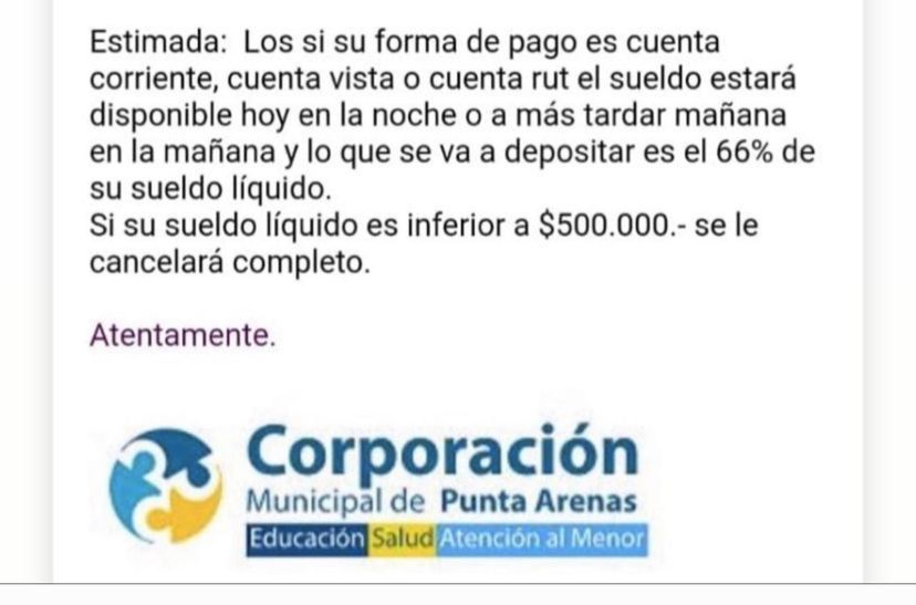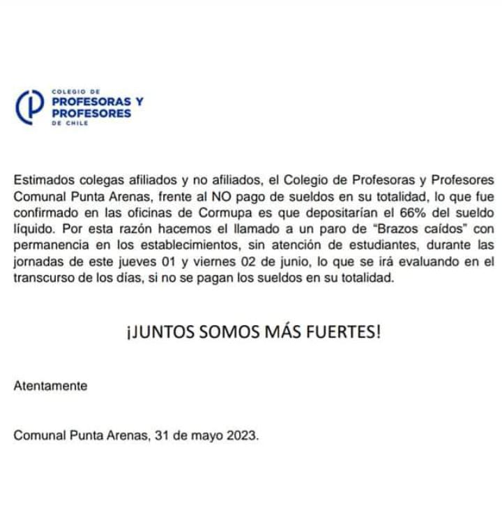El Colegio de Profesores de Punta Arenas declaró para este jueves 1 de junio un paro de brazos caídos ante el pago del 66% de las remuneraciones de los docentes de establecimientos municipales, inferiores a $ 500.000 mensuales..