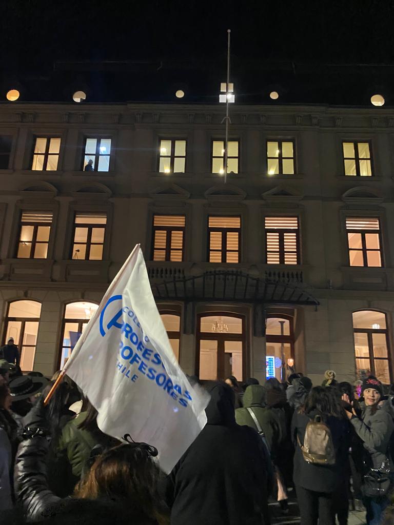 La manifestación se realizó en la plaza de los Derechos Humanos en avenida Colón con Bories donde tuvo lugar una intervención en que los educadores presentaron una sala de clases y continuó frente al Teatro Municipal donde se realizó una reunión de trabajo.