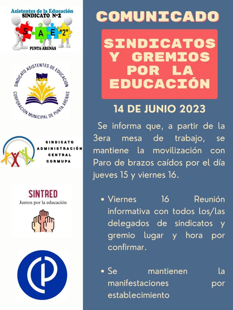 Sindicatos y gremios de la Educación municipal de Punta Arenas continúan paro de brazos caídos este jueves y viernes Ovejero Noticias 14 de junio de 2023 NOTICIAS, PUNTA ARENAS Sindicatos y gremios de la Educación municipal de Punta Arenas continúan paro de brazos caídos este jueves 15 y viernes 16 de junio, según comunicado hecho público esta tarde de miércoles 14. El texto del comunicado es el siguiente: COMUNICADO PÚBLICO 14 junioDescarga CompartirTwittearCompartirPin0 Compartir