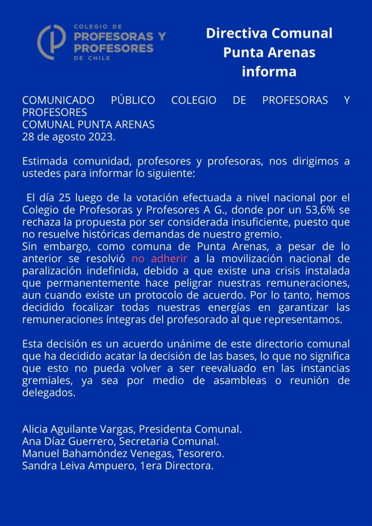 La declaración del gremio señala que no adherirán al paro como consecuencia de la crisis que afecta a los docentes de Punta Arenas y que hace peligrar las remuneraciones de los profesores. Recordemos que los profesores de Punta Arenas realizaron un paro prolongado de actividades durante todo el mes de junio y parte de julio recién pasado afectando a más de 11.000 estudiantes de la comuna.