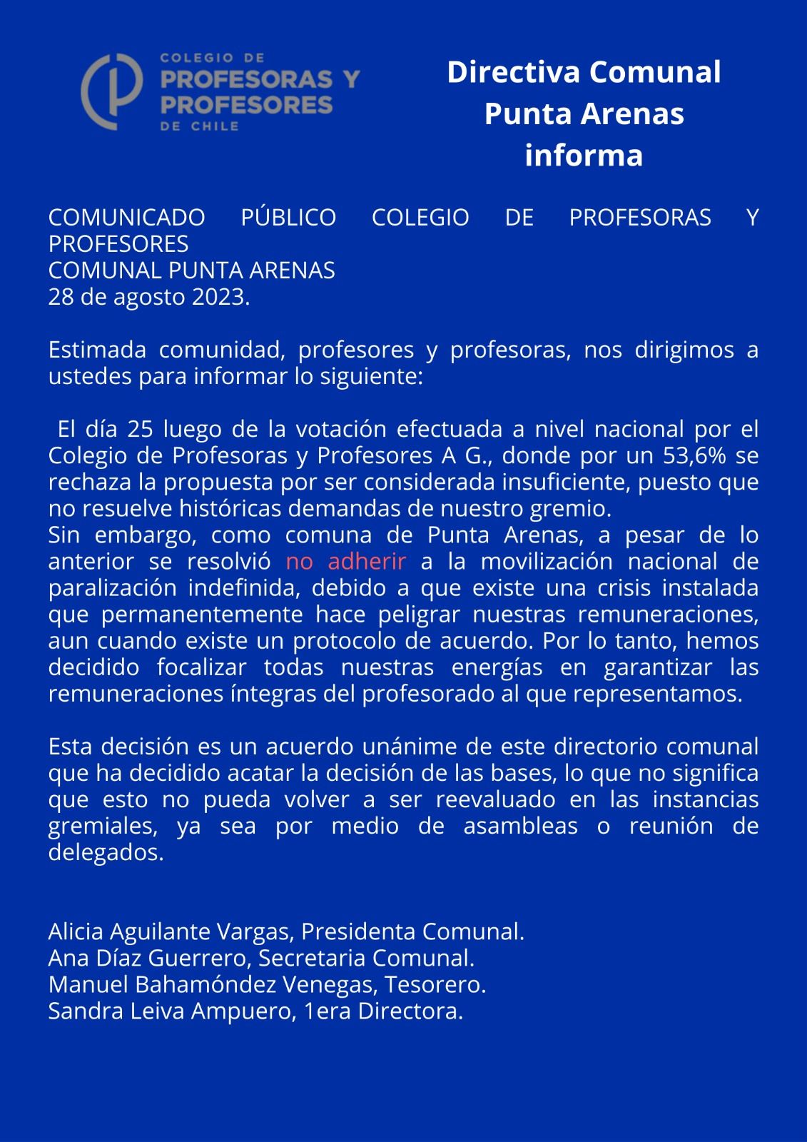 La directiva del Colegio de Profesores Comunal Punta Arenas no adherirá al paro del magisterio convocado para este martes 29 de agosto.