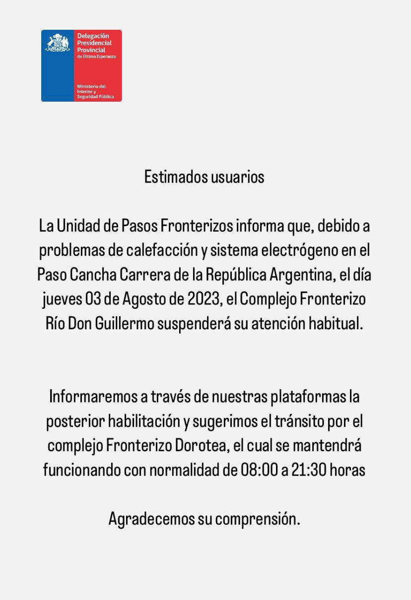 La Unidad de Pasos Fronterizos informa este jueves 3 de agosto que, debido a problemas de calefacción y sistema electrógeno en el Paso Cancha Carrera de la República Argentina, el día jueves 03 de Agosto de 2023, el Complejo Fronterizo Río Don Guillermo suspenderá su atención habitual.