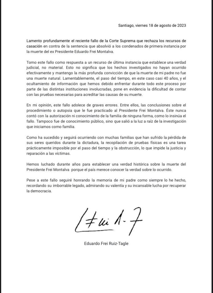 RESPUESTA DE LA FAMILIA DE EDUARDO FREI MONTALVA.