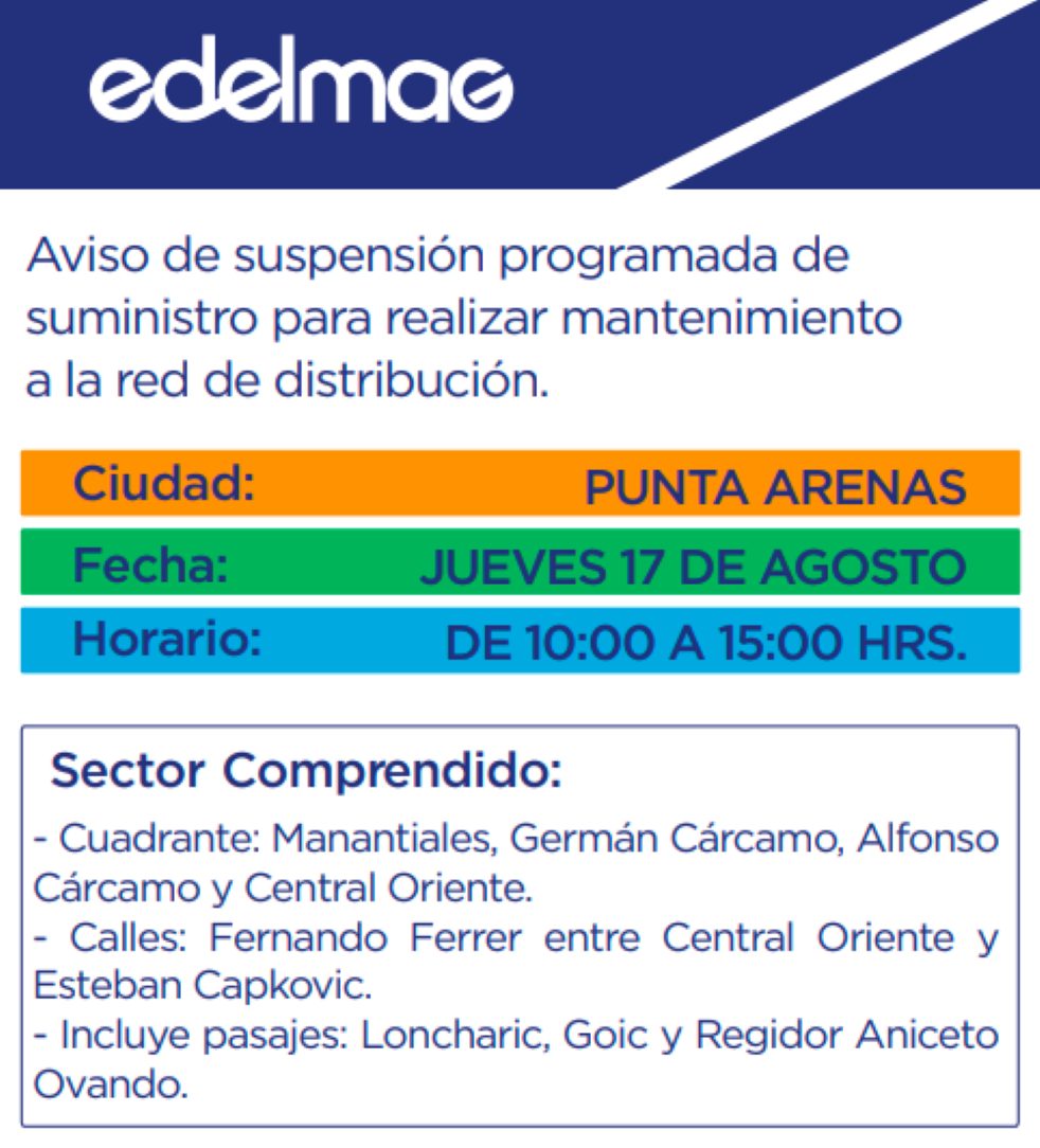 EDELMAG informa cortes programados para la comuna de Punta Arenas en fecha y horario que se detalla.