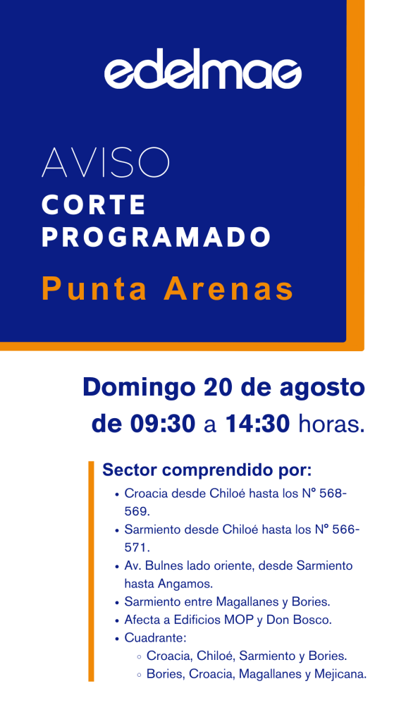 El domingo 20 de agosto de 2023, se realizará un corte programado en el sector centro de la ciudad de Punta Arenas, entre las 9:30 y 14:30 horas, afectando a cerca de 200 clientes.