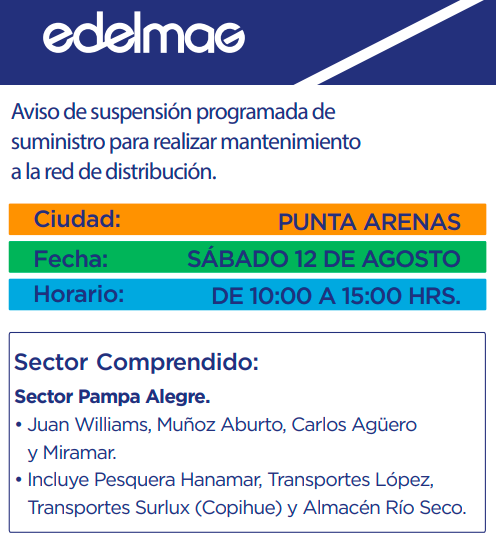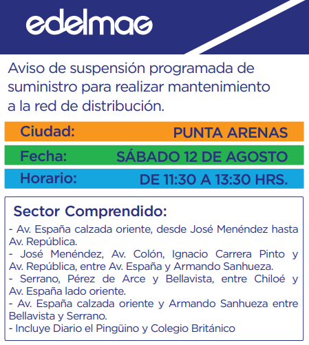 cortes programados en el suministro eléctrico, por faenas de mantenimiento en las líneas de distribución de la ciudad de Punta Arenas para este sábado 12 de agosto, en los sectores y horarios detallados a continuación.