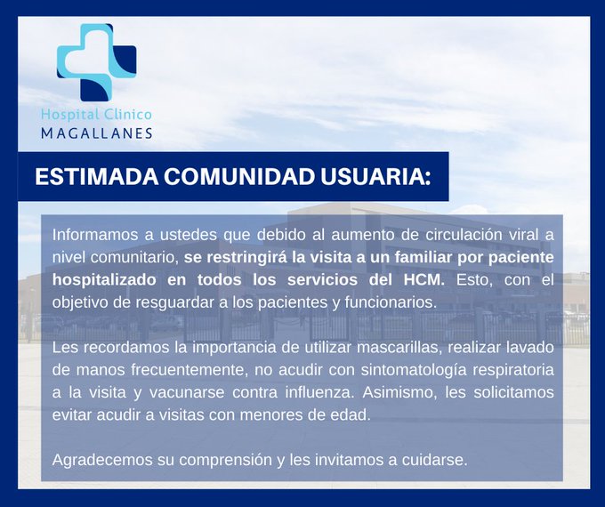 Este jueves 10 de agosto, el Hospital Clínico Magallanes emitió un mensaje a la comunidad magallánica según el cual restringe una visita por paciente en todas las unidades, ante el aumento de la circulación viral comunitaria en la ciudad de Punta Arenas y como una medida de protección para los pacientes y el personal de Salud.