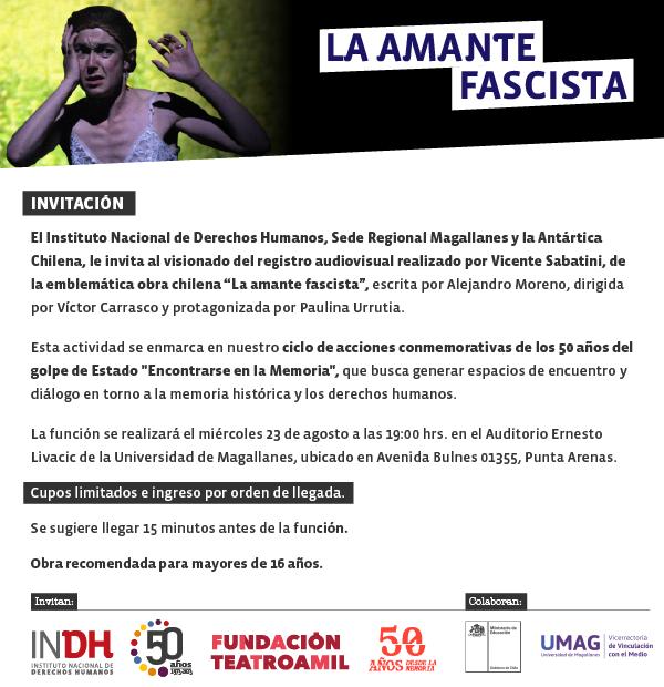 Este miércoles 23 de agosto a las 19 horas se estrena en Magallanes la película «La amante fascista», en la sala auditorium Ernesto Livacic de la Universidad de Magallanes.