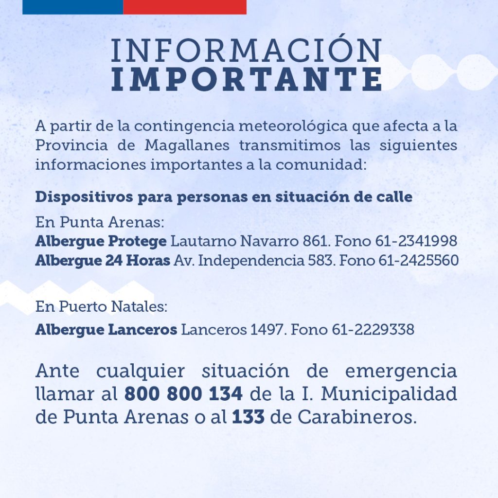 Ante cualquier emergencia, se insta a la población a llamar al número de Emergencias de la Municipalidad de Punta Arenas 800 800 134 o a Carabineros al 133.