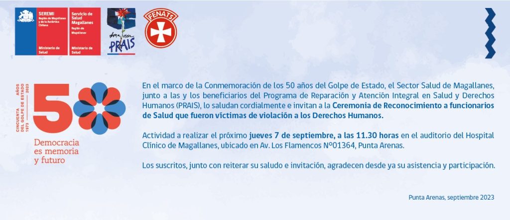 en el marco de la Conmemoración de los 50 años del Golpe de Estado, como Sector Salud de Magallanes junto a las y los beneficiarios del Programa de Reparación y Atención Integral en Salud y Derechos Humanos (PRAIS), realizaremos mañana la Ceremonia de Reconocimiento a funcionarios de Salud que fueron víctimas de violación a los Derechos Humanos.