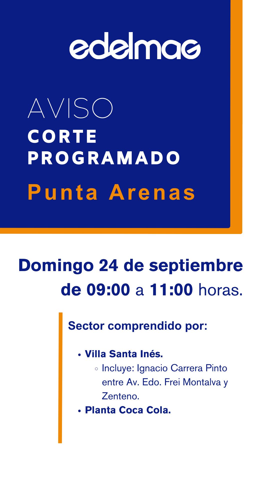Se informa corte programado por mantenimiento en las líneas de distribución para la ciudad de Punta Arenas, el domingo 24 de septiembre en los sectores y horarios que se detalla: