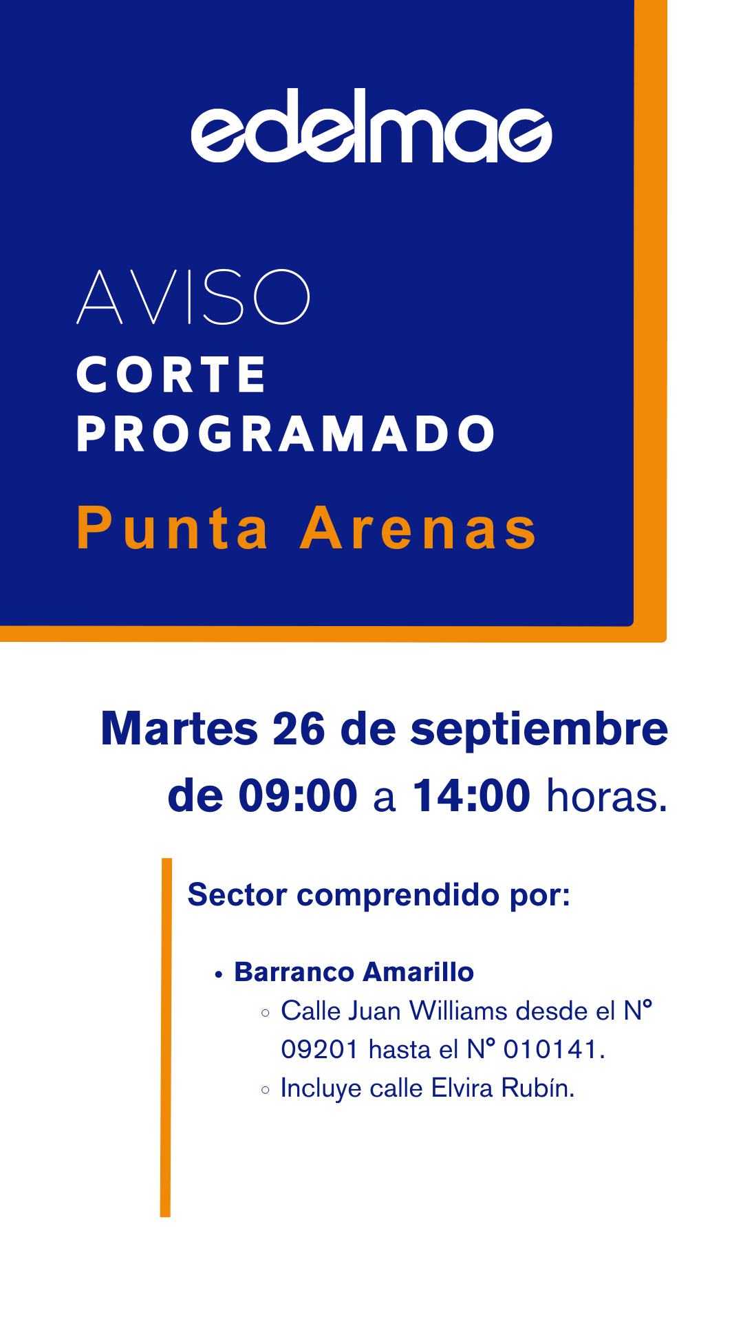 Se informa corte programado por mantenimiento en las líneas de distribución para la ciudad de Punta Arenas, mañana martes 26 de septiembre en sector y horario que se detalla:
