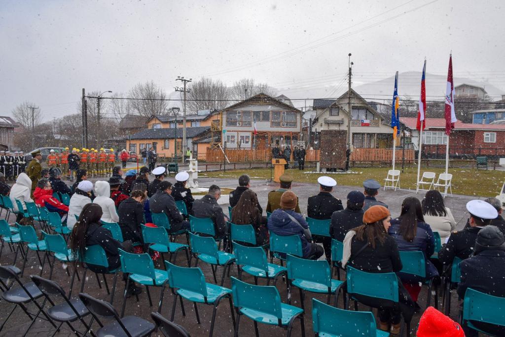 Los chubascos de nieve, que comenzaron a precipitar de manera intermitente a partir de la noche del viernes pasado, acompañaron desde horas previas a esta actividad solemne desarrollada al mediodía de hoy lunes 18 de septiembre. Pese a estas adversidades meteorológicas, autoridades, jefas y jefes de servicio públicos y la comunidad en general, se congregaron en la Plaza Bernardo O’Higgins para celebrar esta instancia en la zona más austral de la nación.