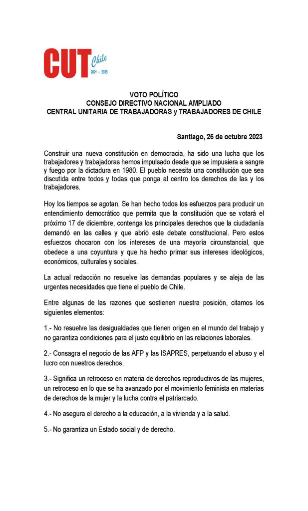 Haciendo un llamado al movimiento sindical y a la ciudadanía a votar en contra en el plebiscito de salida del 17 de diciembre”.