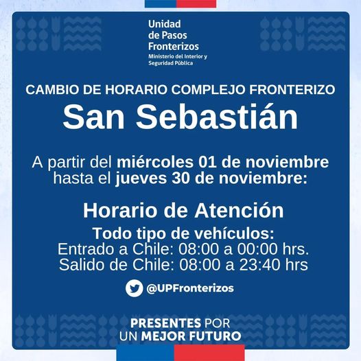 La Unidad de Complejos Fronterizos de la Delegación Provincial de Tierra del Fuego informa que desde el miércoles 1° de noviembre se amplía el horario de atención en Complejo Fronterizo San Sebastián en Tierra del Fuego.