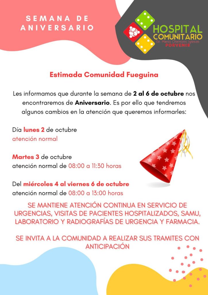 Entre el próximo lunes 2 y el 6 de octubre se conmemora la semana de aniversario de la fundación del Hospital Comunitario de Porvenir, lo que motivará modificaciones en los horarios de atención al público, según informó la Delegación Provincial de Tierra del Fuego.
