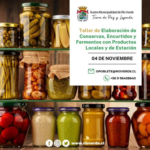 La Municipalidad de Río Verde a través de su alcaldesa Sabina Ballesteros @sballesterosv invita este sábado 4 de noviembre a ser parte de nuestro Taller de Elaboración de Conservas, Encurtidos y Fermentos con Productos Locales y de Estación.
