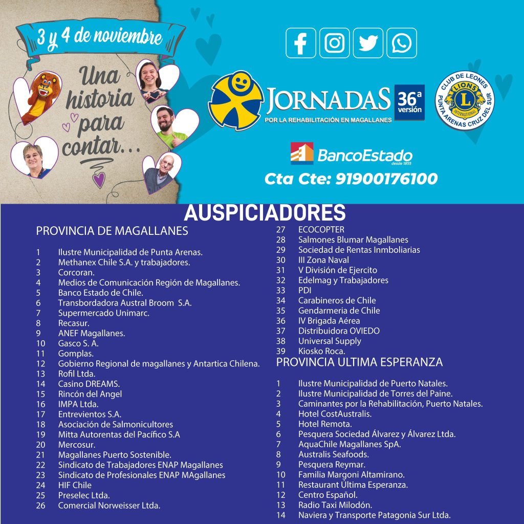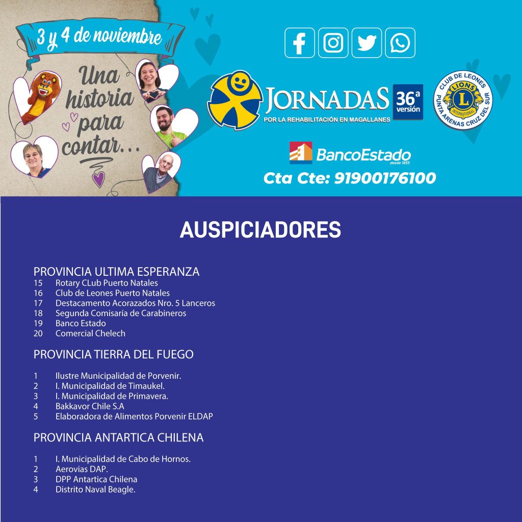 Las principales instituciones públicas auspiciadoras de las Jornadas fueron las Delegaciones Presidenciales Regional y Provincial y las Municipalidades, Carabineros, Ejército, Armada, Fuerza Aérea, organizaciones gremiales y empresas regionales de la industria salmonera, del rubro turístico y hotelero, Sociedad de Rentas Inmobiliarias y Supermercados Unimarc.