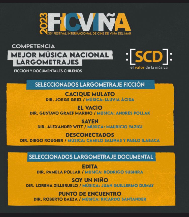 El grupo musical magallánico Lluvia Acida, informó que ha recibido una muy buena noticia: la banda sonora de la película magallánica «CACIQUE MULATO: LA LEYENDA DE CHUMJALUWUN», que compusimos con LLUVIA ÁCIDA, quedó preseleccionada en la etapa final de la Competencia Mejor Música Chilena de Largometraje Nacional FICVIÑA 2023 (categoría de Largometraje de Ficción).