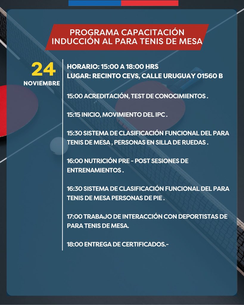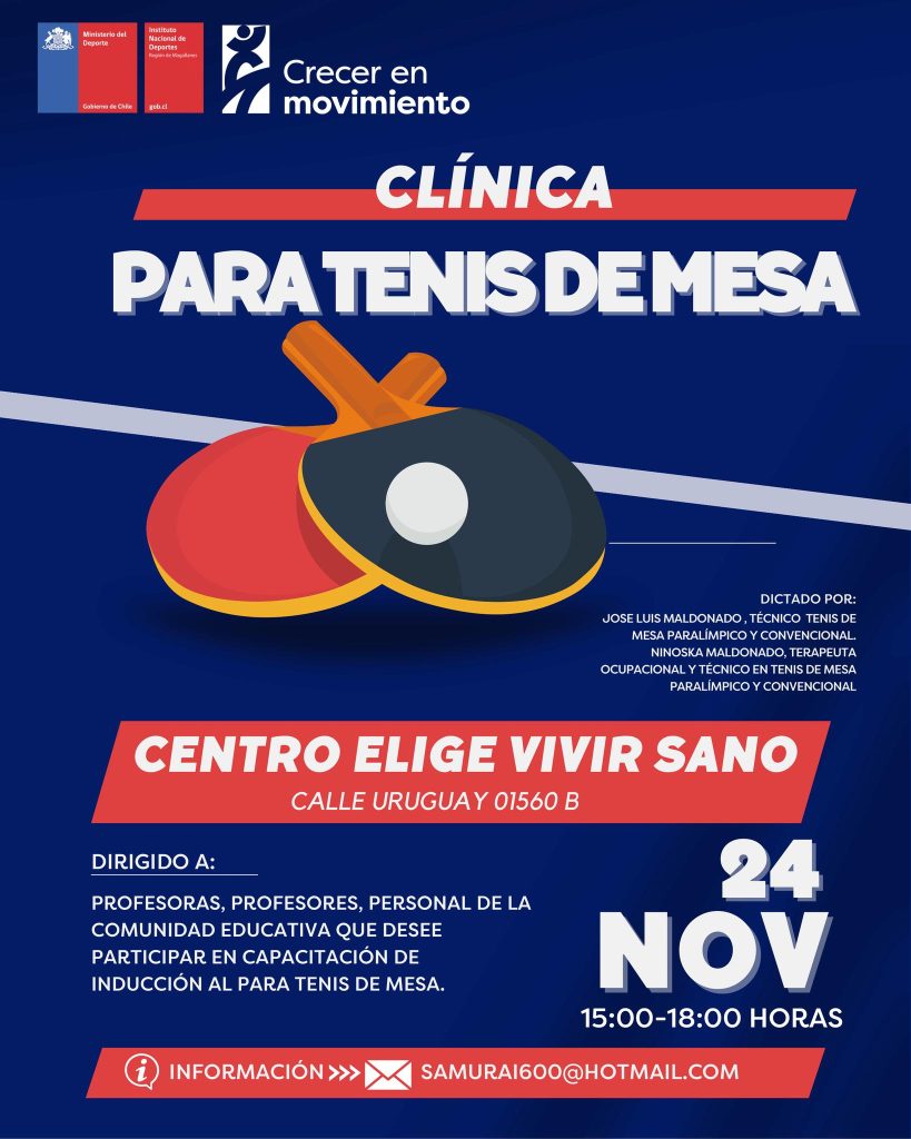 Esta actividad se realizará este viernes 24 de noviembre entre 15 a 18 hrs. se realizará la Clínica de Para Tenis de Mesa.